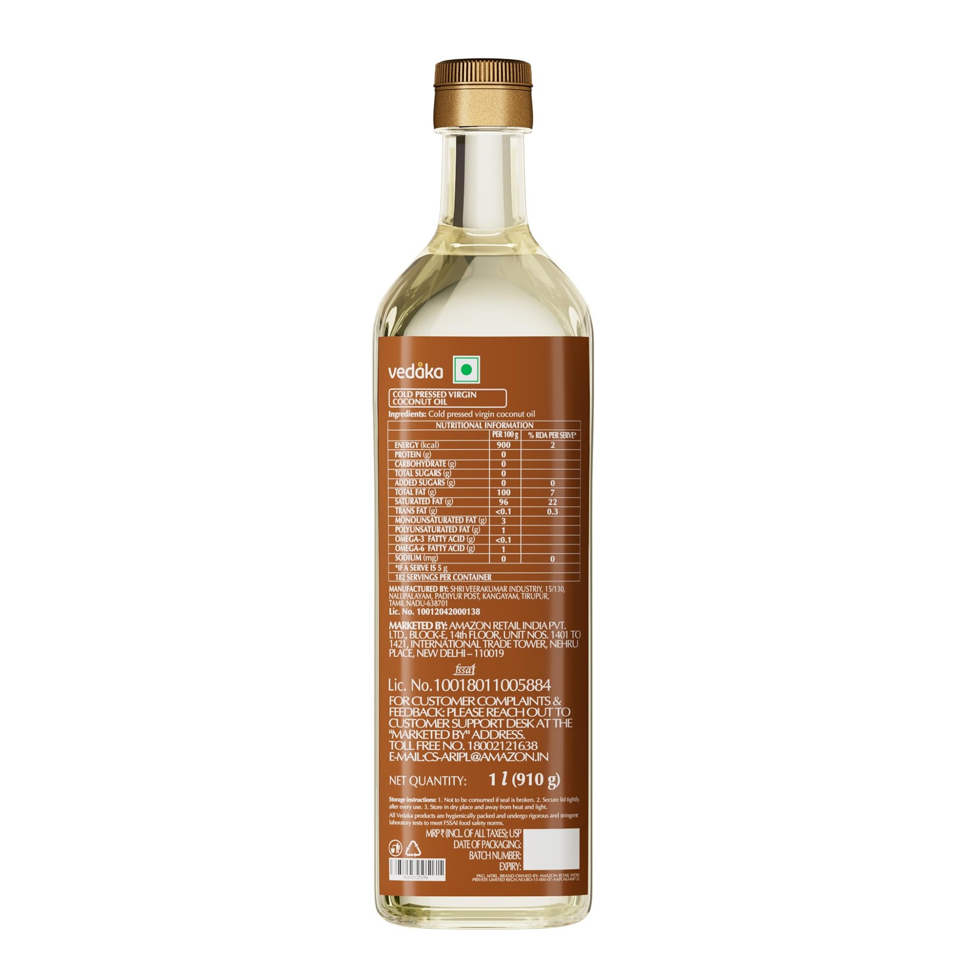 Amazon Brand - Vedaka Cold Pressed Virgin Coconut Oil 1 L Bottle | 100% Pure | Effective with Good Smell
